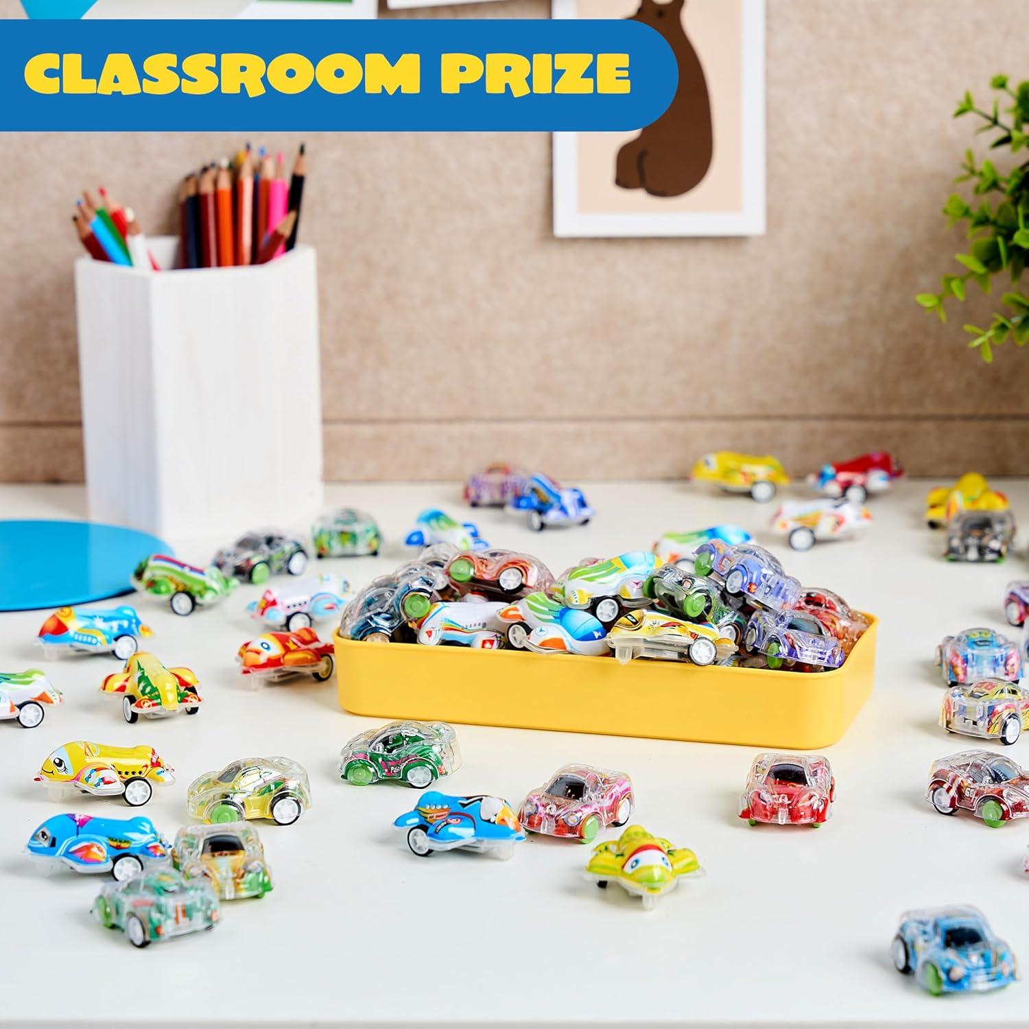 AWESOME PARTY FAVORS: This Mini Pull Back Cars Set has 50 Pcs: 25 cool little cars and 25 airplanes for racing fun! Perfect for goodie bag stuffers, treasure box rewards, or pinata fillers that boys and girls will love. VARIETY OF DESIGNS: With up to 20 different design types, kids will love racing a variety of colorful and fun mini cars, keeping the excitement going for hours. RACE WITH FRIENDS: These mini pull back cars are great for group activities, team games and friendly races, encouraging kids to work together while having fun. FUN FOR EVERYONE: These mini cars are perfect for birthday parties, classroom prizes, presents, and other celebrations. They are great for entertaining large groups of kids at any event. SAFE AND DURABLE: Made from non-toxic, high-quality plastic, these cars are safe for kids to use and built to withstand rough play, ensuring long-lasting fun.